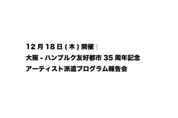 2024年は、大阪市とハンブルク市の友好都市提携35周年にあたる節目の年でした。同年7月に開催した「ART OSAKA 2024」 では、記念事業としてハンブルク在住アーティスト3名を招聘し、特別展を実施しました。(ht … 続きを読む [12月18日(木)開催] 大阪-ハンブルク友好都市35周年記念 アーティスト派遣プログラム 報告会